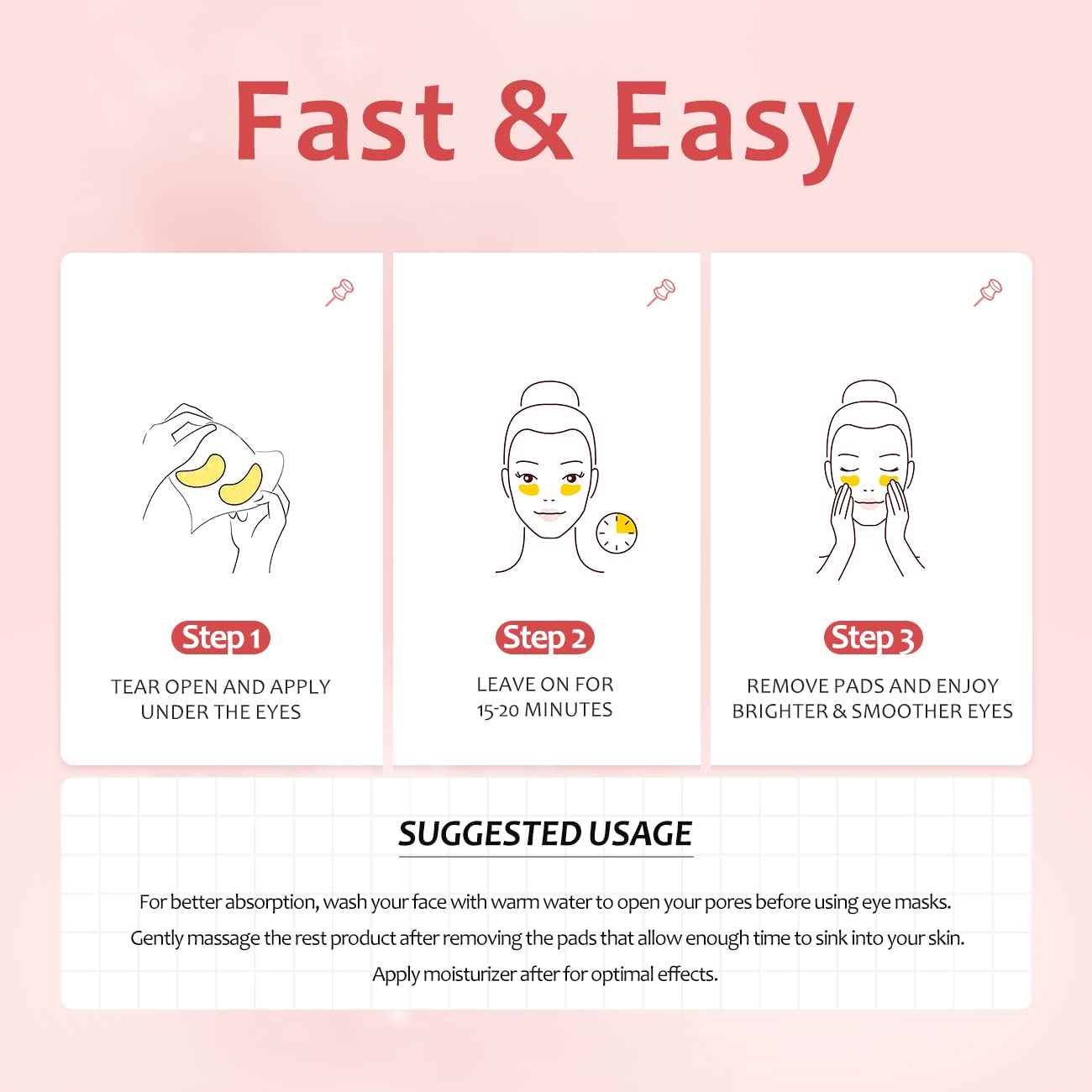 - [How To Use]: After cleansing your skin, tear open the eye mask and place it under each eye. Leave on for 15 to 20 minutes and remove them. You may also apply the eye patches under your eyes, forehead, chin, and neck. Note that eye skin is the most delicate area; please perform an allergy test before use.