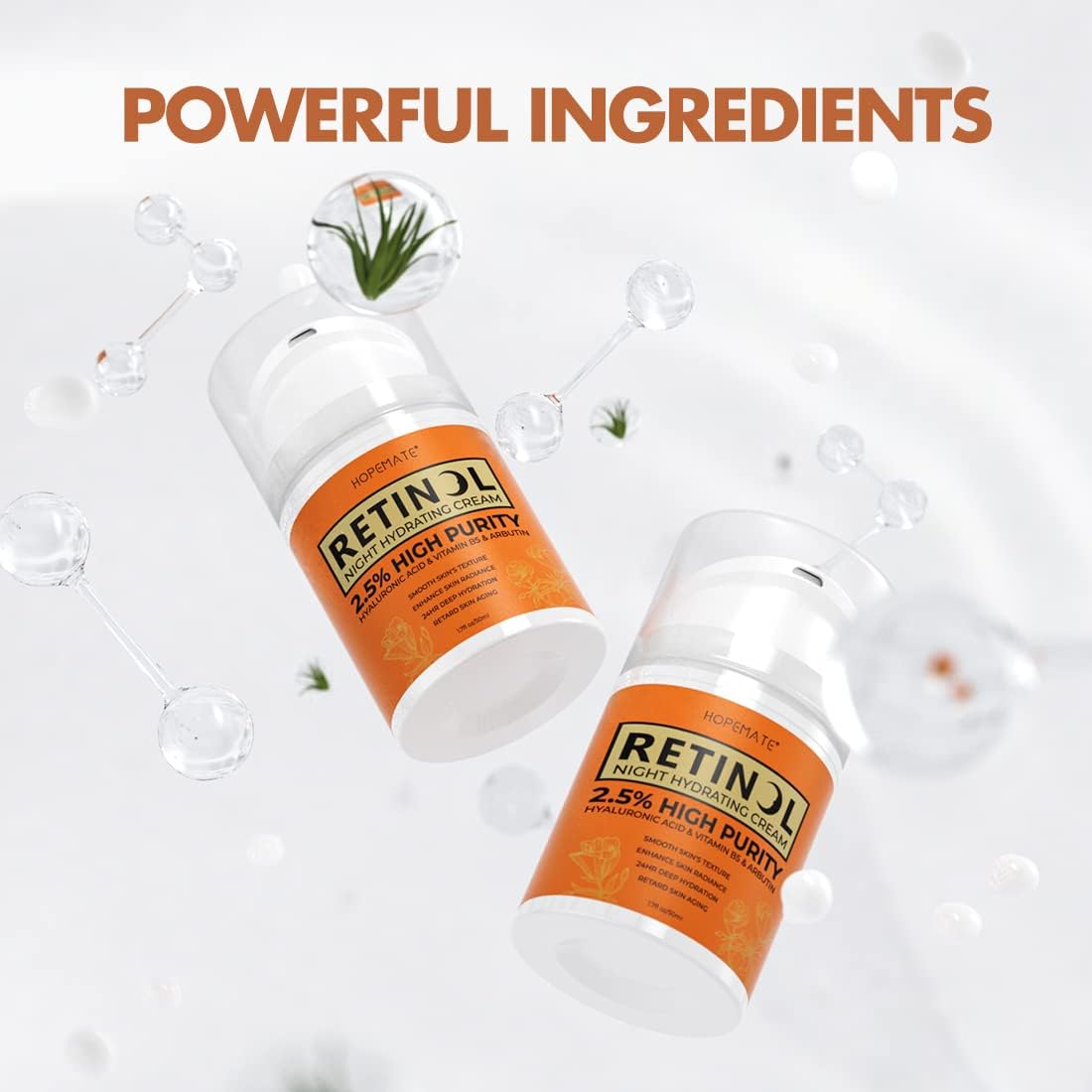 - DEEP HYDRATION NIGHT CREAM: Our night moisturizer is powered by 2.5% pure Retinol and boosted by Vitamin B5, Vitamin E, Hyaluronic Acid. It can effectively promote collagen regeneration and can make you stay hydrated throughout your sleep.